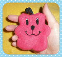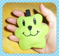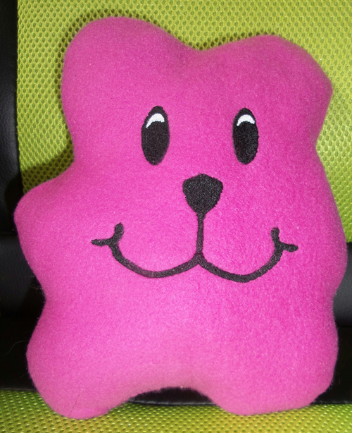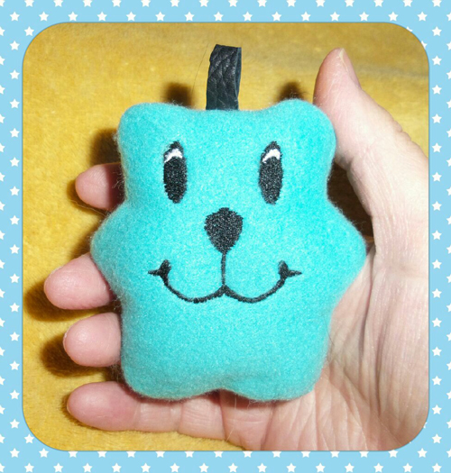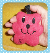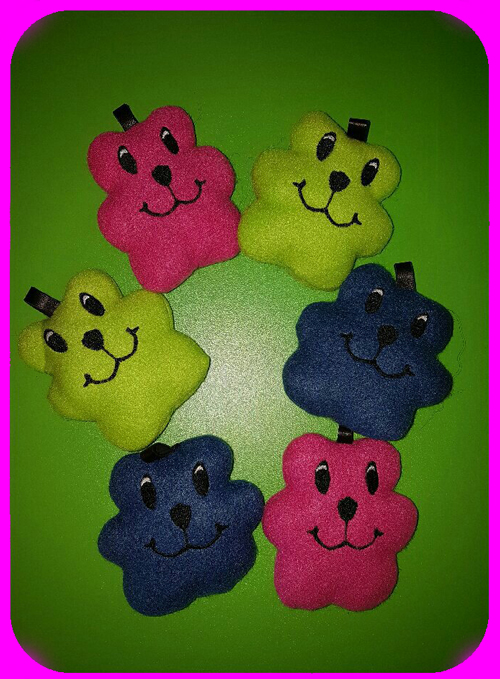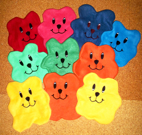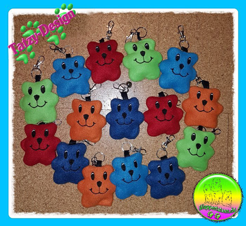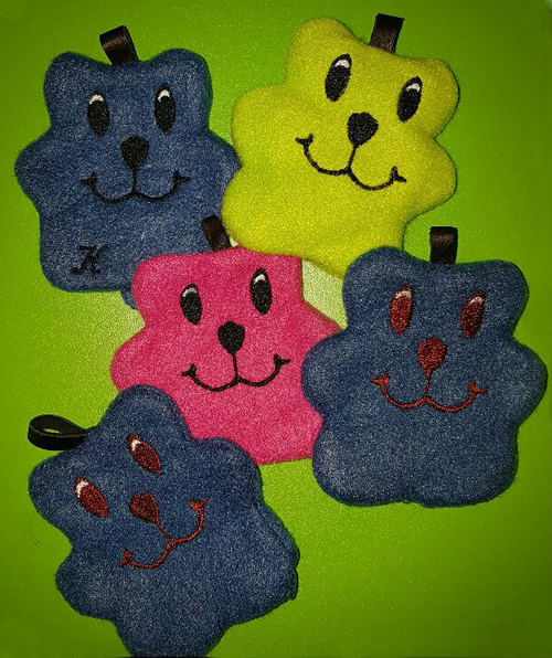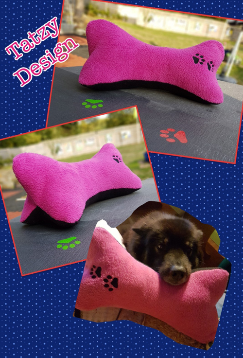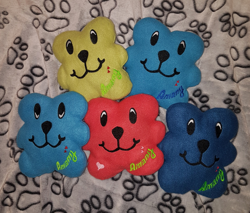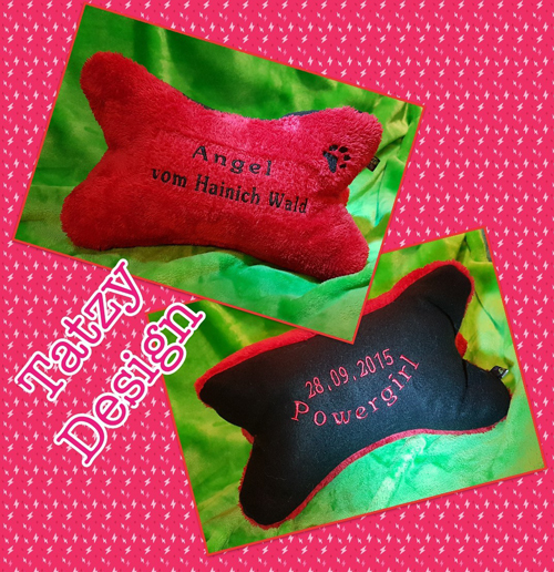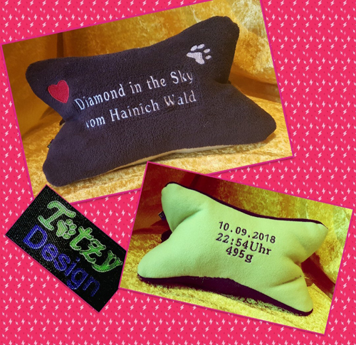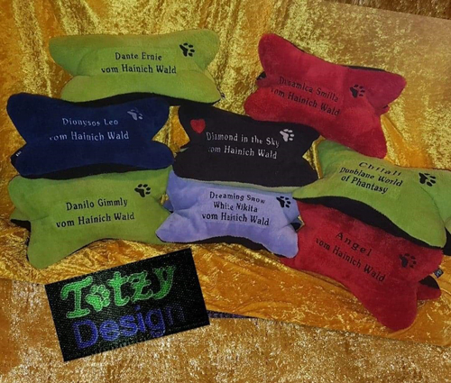 gefüllt und mit Geräuschen, immer mit einer kleinen Lasche um sie an die Leine zu legen ... sie sind dann halt immer online ... natürlich besticke ich sie selbst ... |